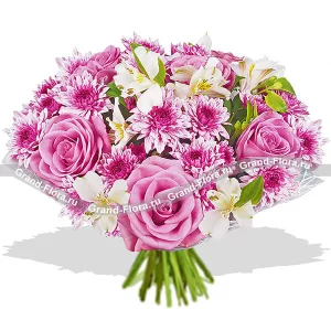 С любовью и нежностью - букет из кустовых хризантем, роз и альстромерий