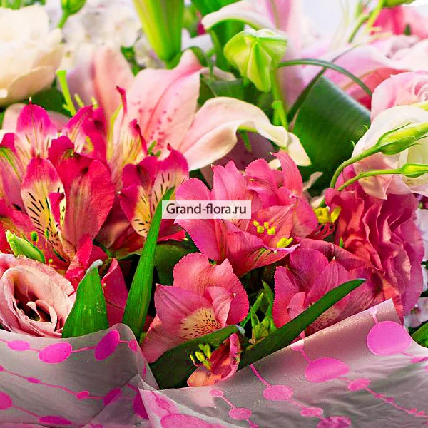 ДЕЛЮКС: лилия розовая -  3 шт, альстромерия розовая - 21 шт, эустома розовая - 11 шт, эустома белая  -  10 шт, декоративная зелень, фетр розовый. Примерный диаметр букета 50х50 см.