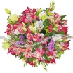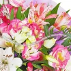 Уменьшенный: эустома розовая - 1 шт., эустома фиолетовая - 1 шт., эустома белая - 1 шт., альстромерия розовая - 3 шт., альстромерия белая - 1 шт., фетр светло-фиолетовый.