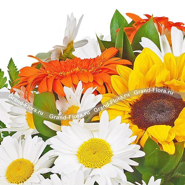 Стандартный (на фото): ромашка белая - 15 шт, гербера оранжевая - 3 шт, подсолнух - 1 шт, рускус,  папоротник - 5 шт, сетка зеленая.