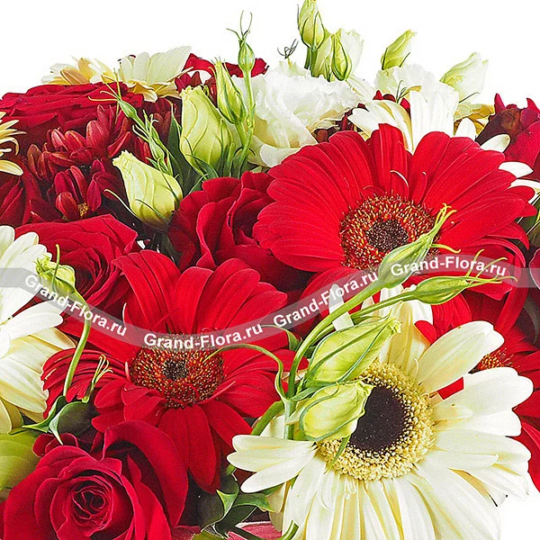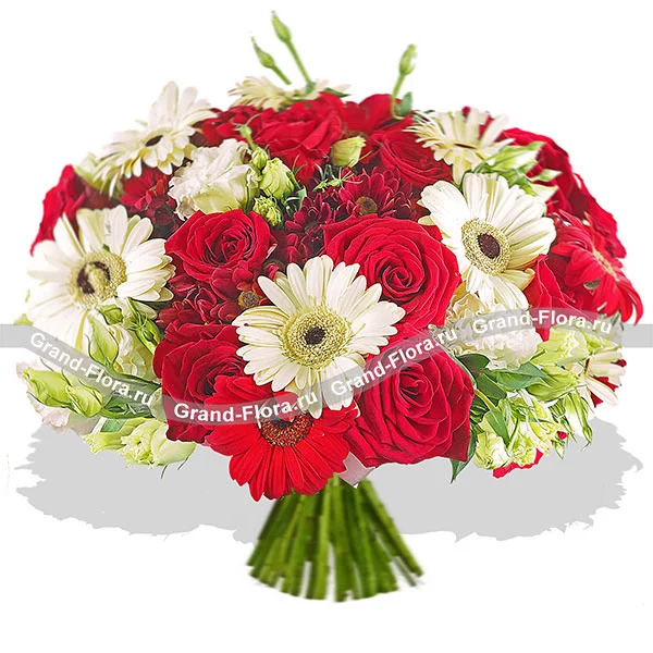 Стандартный (на фото): роза красная - 11 шт, гербера белая - 6 шт, хризантема кустовая красная - 5 шт, эустома белая - 5 шт, сетка красная.