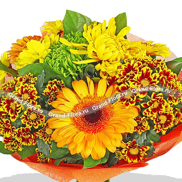 ЛЮКС: гербера оранжевая - 5 шт., хризантема желтая одноголовая - 2 шт., хризантема зеленая одноголовая - 2 шт., хризантема желтая кустовая - 2 шт., хризантема кустовая оранжевая - 3 шт., салал, оранжевый фетр.