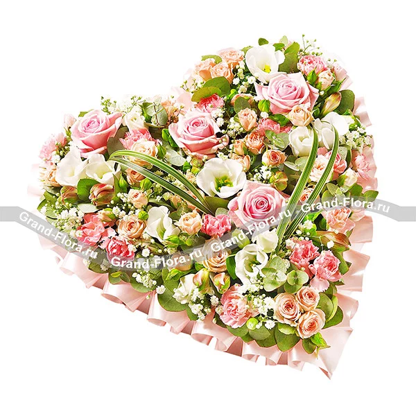 Мечта Богини - сердце из оазиса с розовой розой, эустомой и альстромерией