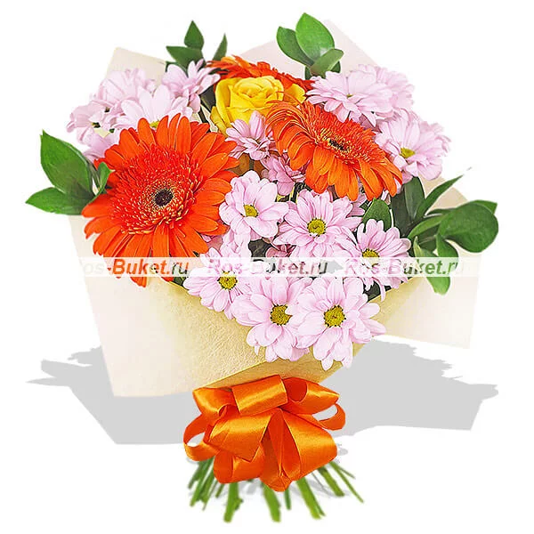 Стандартный (на фото): роза желтая (в центр) - 1 шт, гербера оранжевая - 3 шт, хризантема кустовая светло-розовая - 3 шт, рускус, фетр желтый, бант оранжевый.