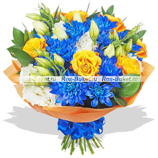 ДЕЛЮКС: роза кустовая желтая - 6 шт, эустома белая - 8 шт,  хризантема кустовая синяя - 7 шт, рускус, оранжевый фетр, бант синий.