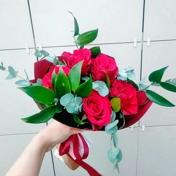 5 роз: роза красная - 5 шт., рускус - 3 шт., эвкалипт - 2 шт., упаковка, бант красный.
