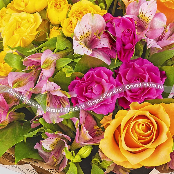 Стандартный: оранжевая роза - 3 шт, кустовая розовая роза - 2 шт, альстромерия розовая - 5 шт,