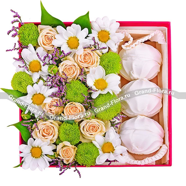 Стандартный: хризантема кустовая зеленая - 2шт., роза кустовая кремовая - 5 шт., хризантема кустовая белая - 3 шт., лимониум(статица) - 3шт., декоративная зелень, зефир, оазис, коробка.