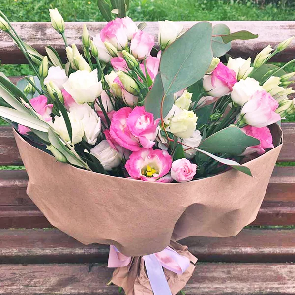 Стандартный: эустома розовая - 7 шт., эустома белая - 4 шт., декоративная зелень, упаковка крафт, лента розовая.