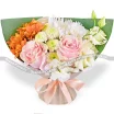 Уменьшенный: роза розовая - 3 шт., хризантема кустовая оранжевая - 1 шт., эустома белая - 1 шт., хризантема одноголовая белая - 1 шт., хризантема белая кустовая - 1 шт., гвоздика белая - 2 шт., упаковка, лента. Примерный размер: 25Х25 см.