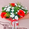 Уменьшенный: хризантема кустовая белая - 5 шт., гербера красная - 2 шт., декоративная зелень, упаковка, лента. Примерный диаметр букета 25х25 см.