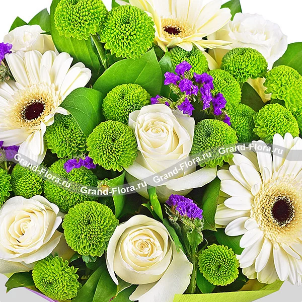 ДЕЛЮКС:  роза белая - 15 шт, гербера белая - 9 шт, хризантема кустовая зеленая - 10 шт, статица - 7 шт, салал, фетр из двух слоев - зеленый и фиолетовый, лента. Примерный размер: 45Х45 см.
