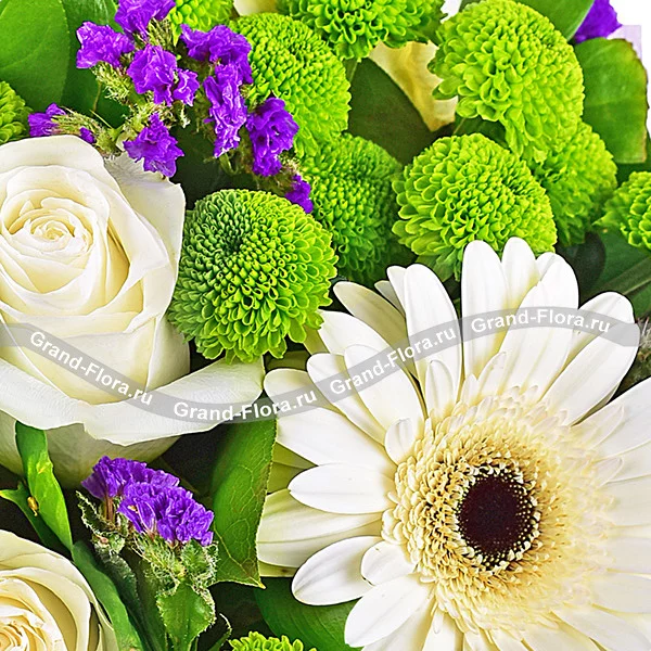 Нежную композицию, составленную из светлых роз и гербер, превосходно подчеркивает кустовая зеленая хризантема. Особое очарование и выразительность придает статица. Яркий фиолетовый букет великолепно подойдет для того, чтобы поздравить коллегу с дня рождения или любым другим торжеством.